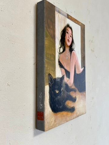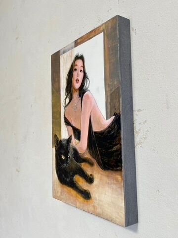 美しい黒猫と心を惹きつけるアンニュイな女性が描かれたサムホールサイズ(24×18センチ)の原画です。