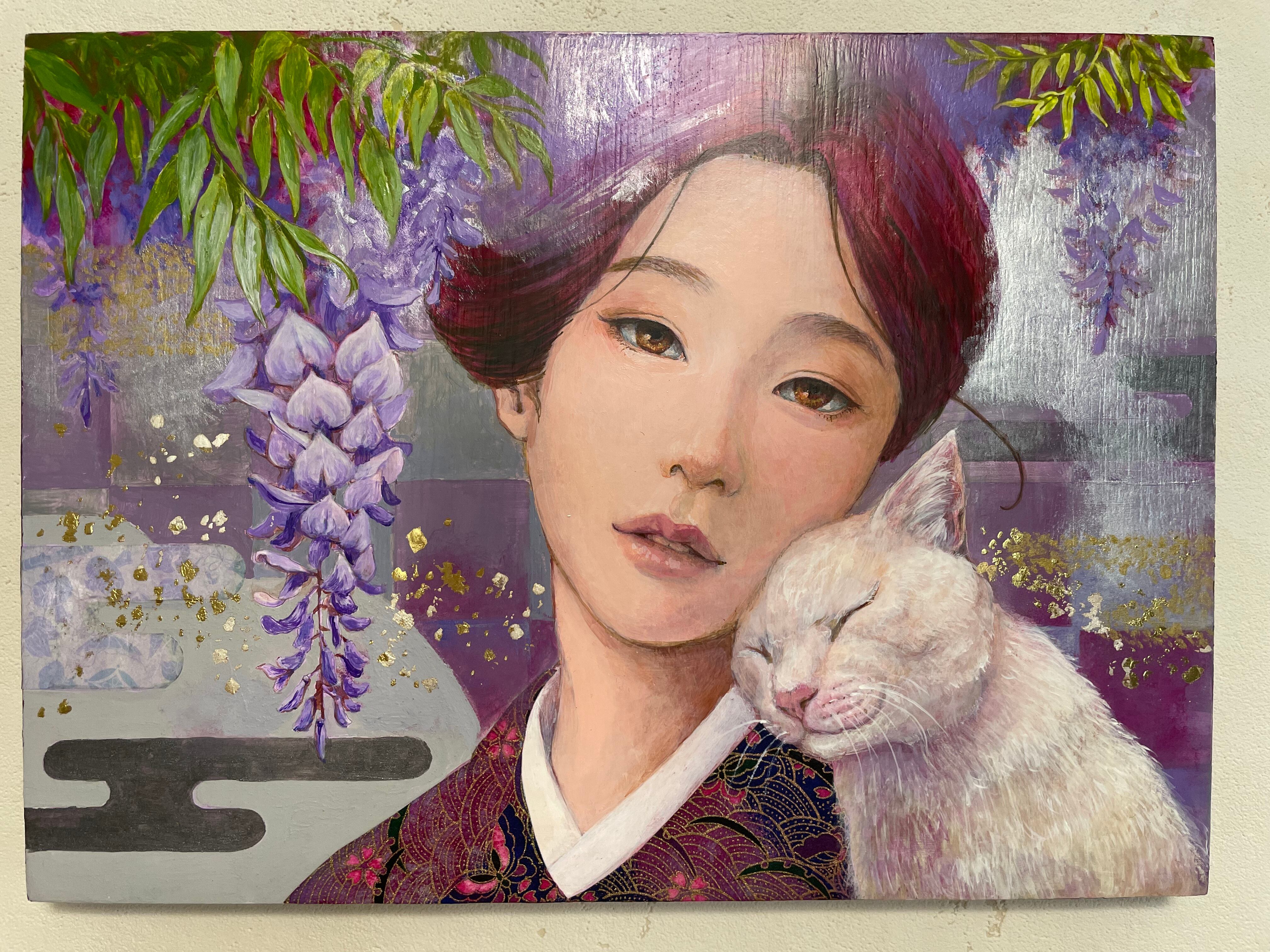 和装の女性と白猫の間に流れる穏やかで親密な空間を描きました。F4サイズ(33.3×24.2cm)の原画です。
