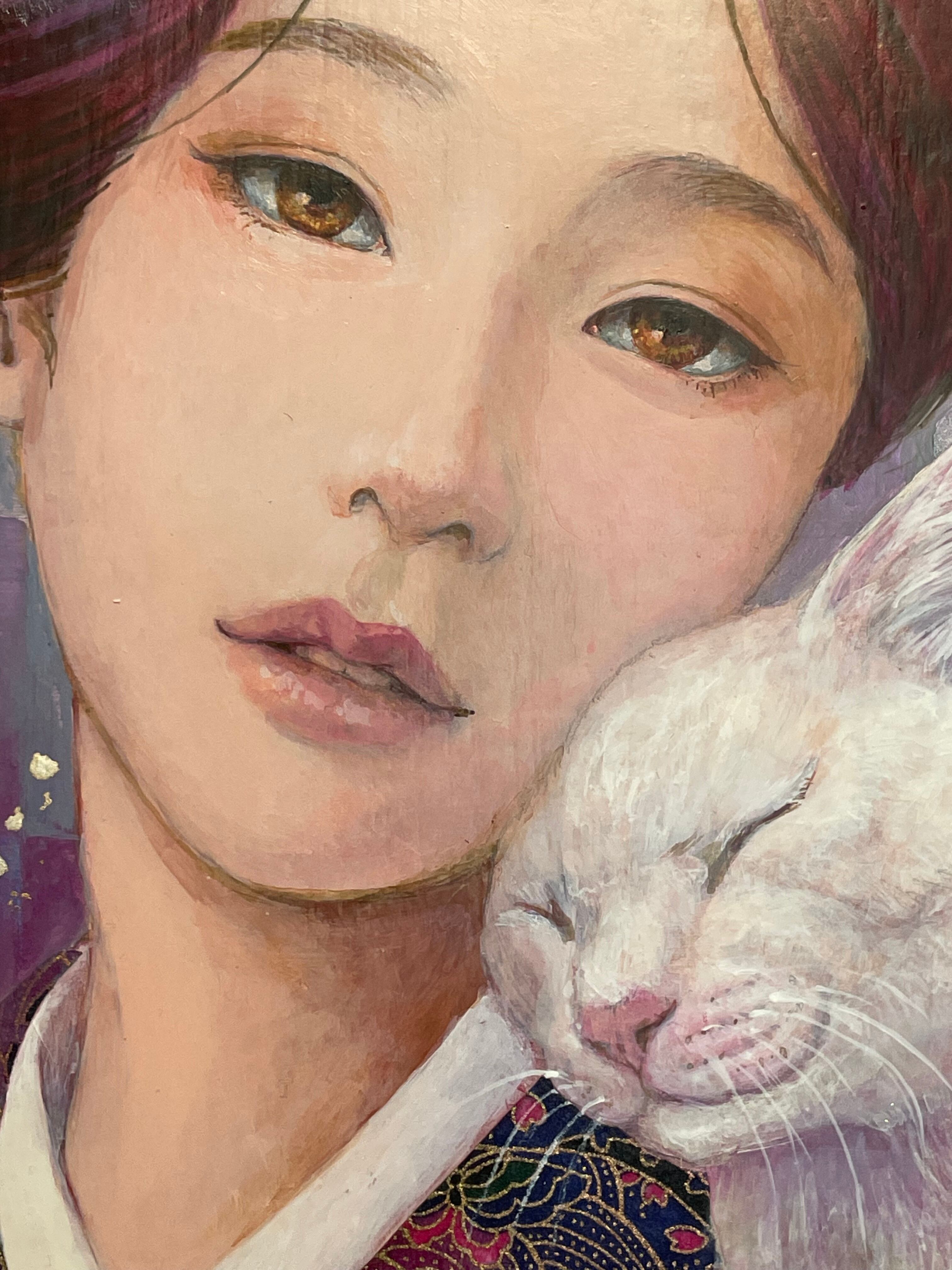 人物の顔や猫に当たる柔らかな光を表現したく、肌の質感や髪の毛の描写、猫の毛並みの柔らかさなど、細部まで丁寧に描きました。人物と猫はしっかりと描き背景は和風の背景の抽象的な要素を表現しバランスを取っています。