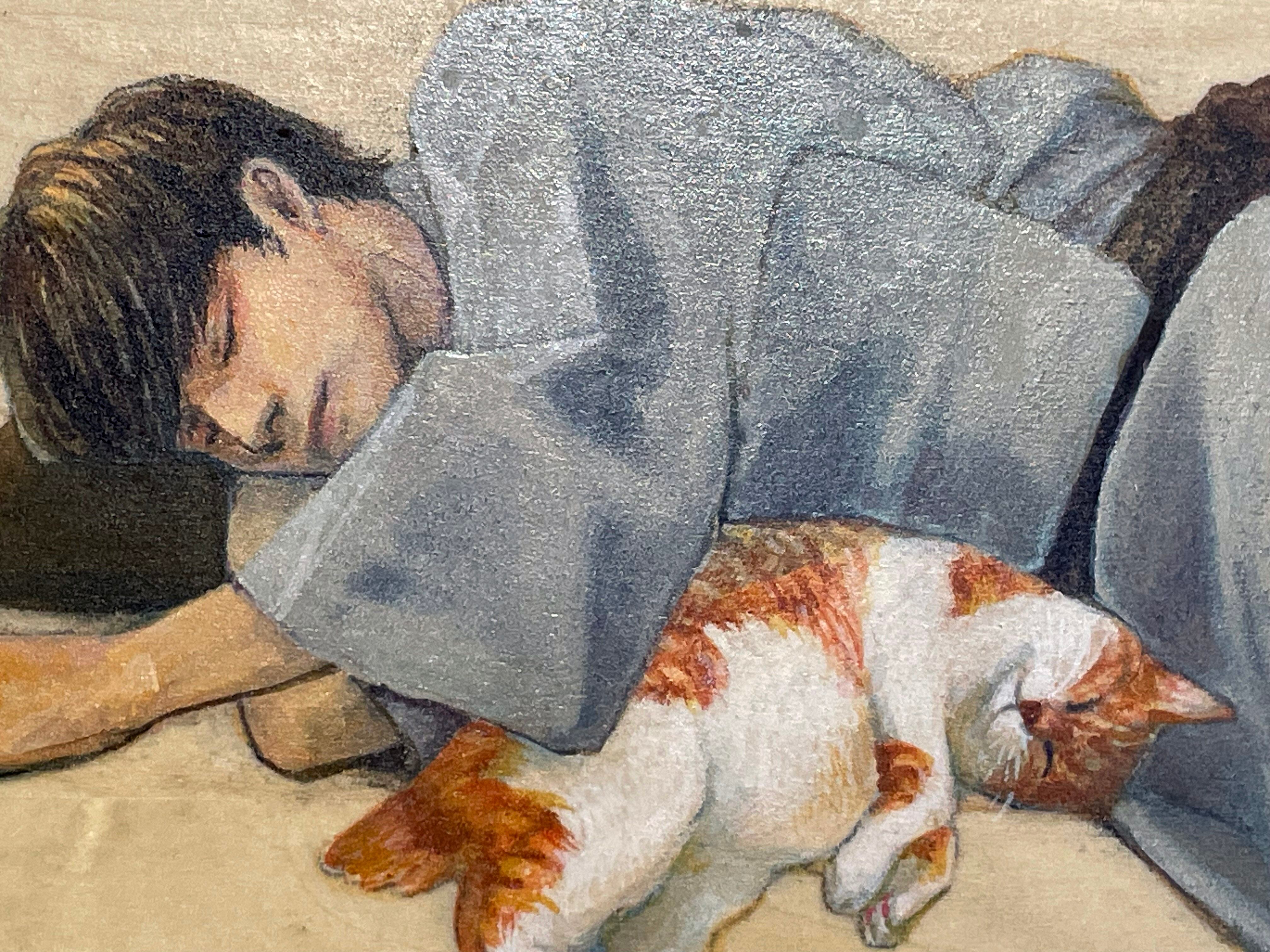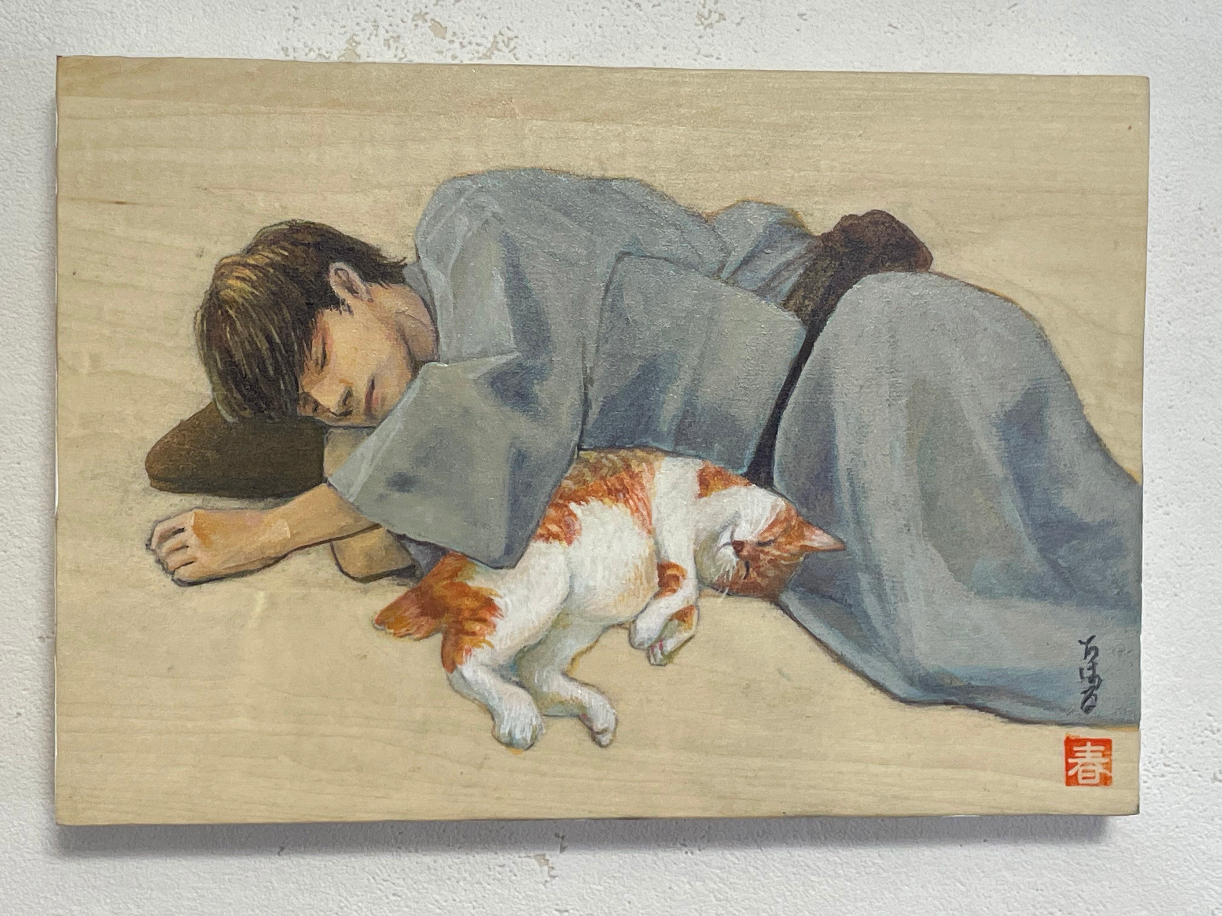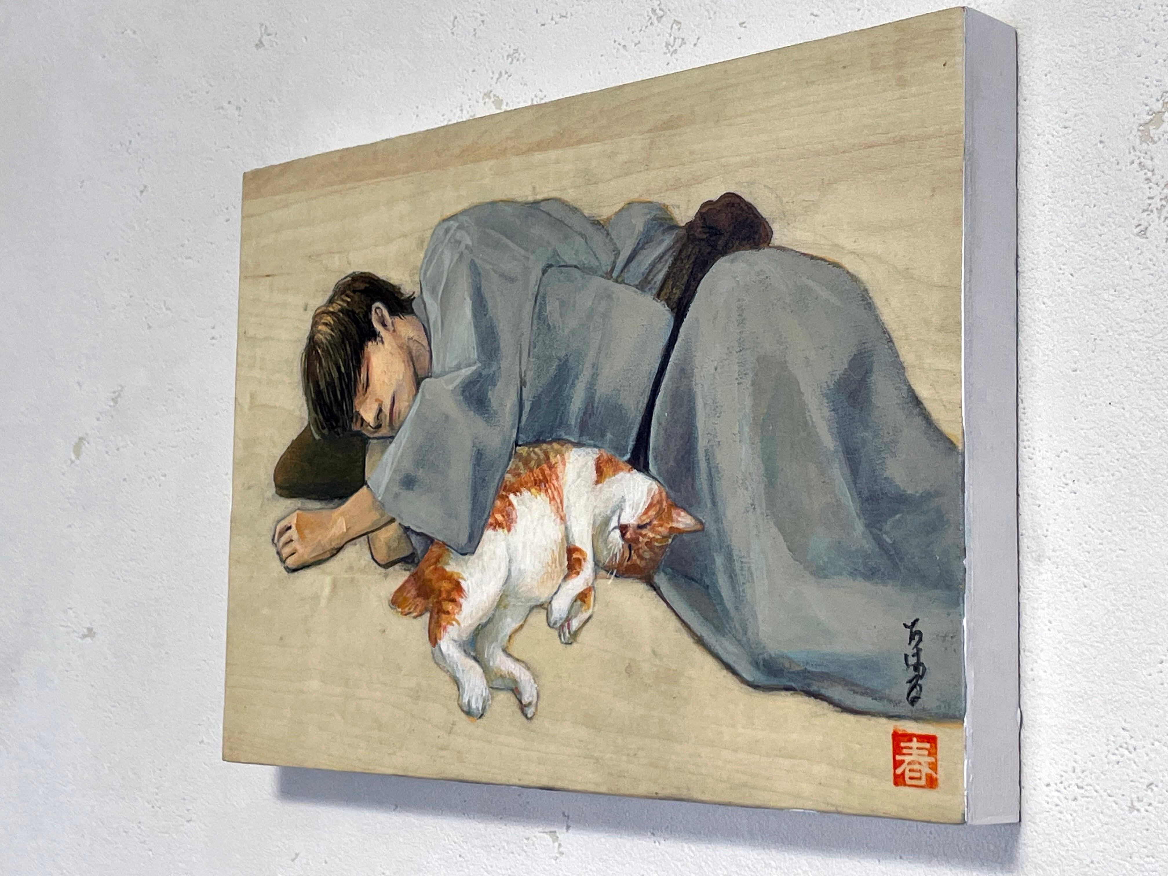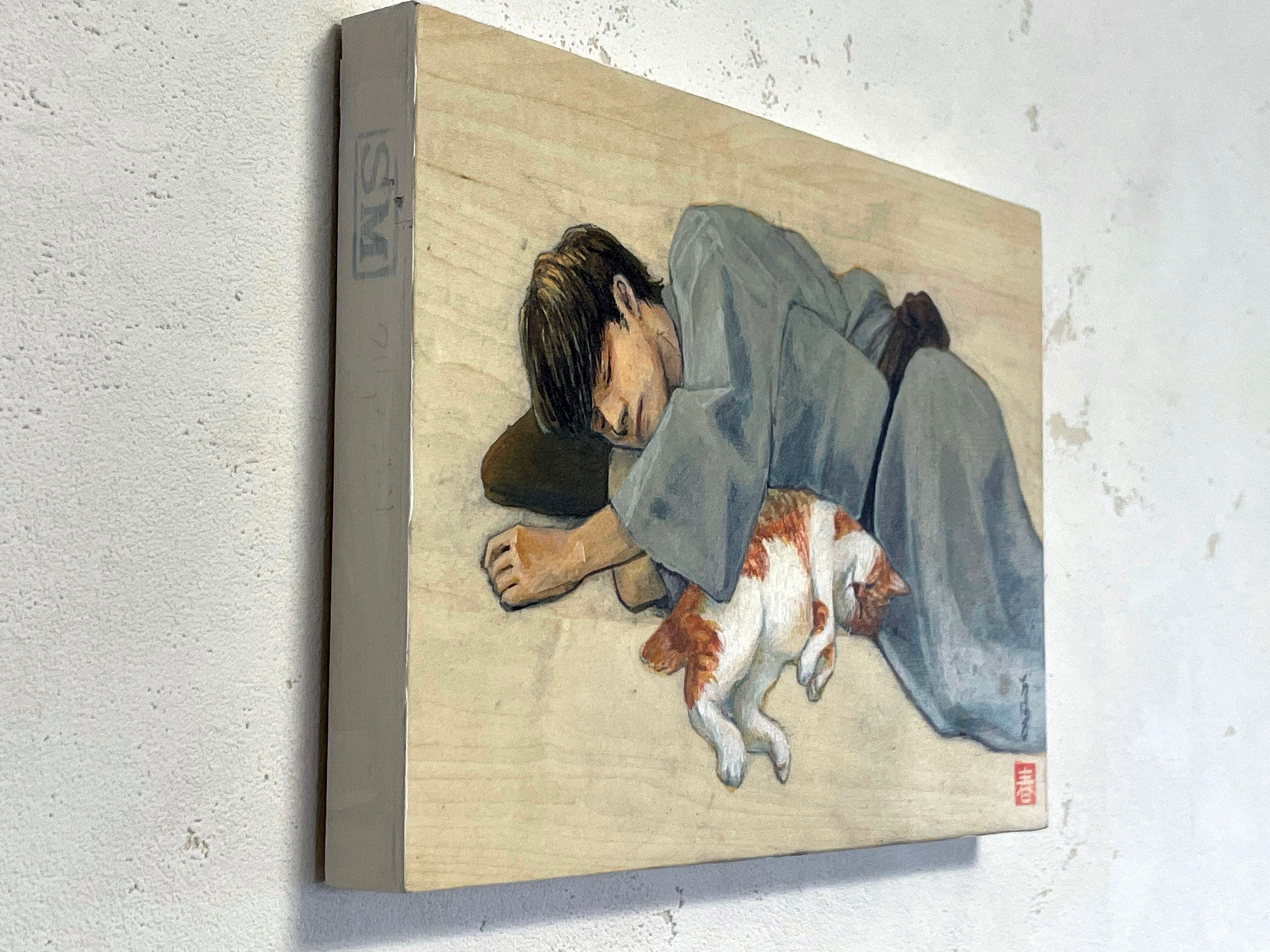 和装の男性と太った茶白猫が幸せそうに寄り添い眠る姿、どこかノスタルジックで穏やかな雰囲気になるように描きました。何もない背景に心の風景を重ねていただけたらと思います